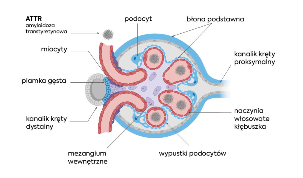 Amyloid odkładający się w nerkach uszkadza układ filtracyjny, co zaburza zdolność nerek do skutecznego oczyszczania krwi z produktów przemiany materii i nadmiaru płynów. W konsekwencji może rozwijać się przewlekła niewydolność nerek.