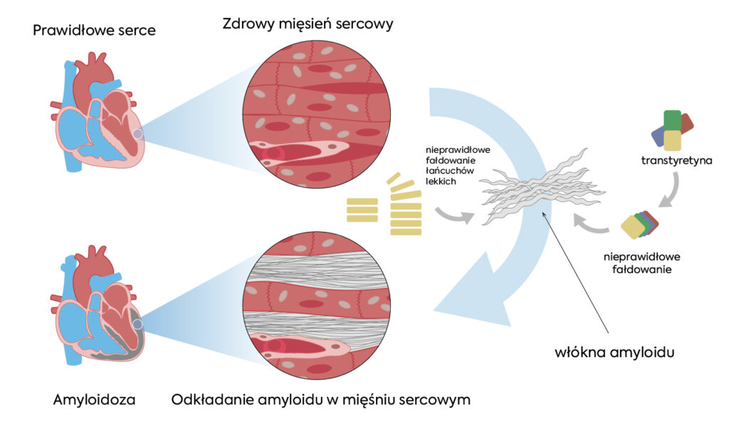 Zajęcie serca w przebiegu amyloidozy może występować zarówno jako element procesu uogólnionego, jak i w postaci izolowanej – częściej obserwowanej u osób w podeszłym wieku. Odkładanie amyloidu w mięśniu sercowym prowadzi do jego usztywnienia oraz zaburzeń funkcji rozkurczowej, co sprzyja rozwojowi kardiomiopatii restrykcyjnej i w konsekwencji niewydolności serca. Z tego względu istotne jest, aby nie ignorować pojawiających się objawów i w odpowiednim czasie zgłosić się do lekarza w celu pogłębienia diagnostyki.