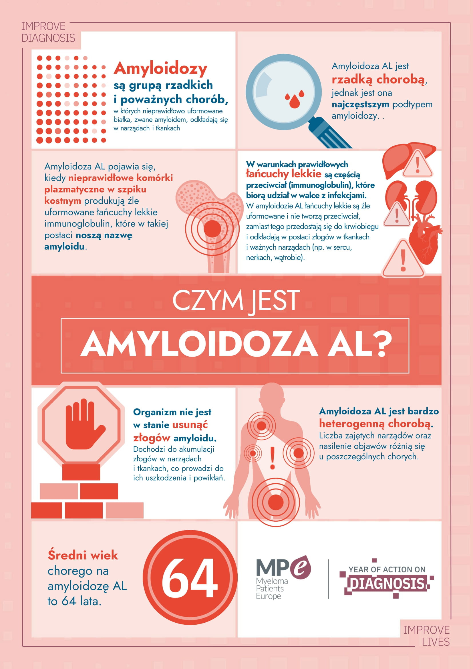 Zachęcamy do zapoznania się z infografikami, objaśniającymi czym jest amyloidoza łańcuchów lekkich oraz jakie niepokojące objawy i symptomy daje ta rzadka choroba, które sami możemy zaobserwować.