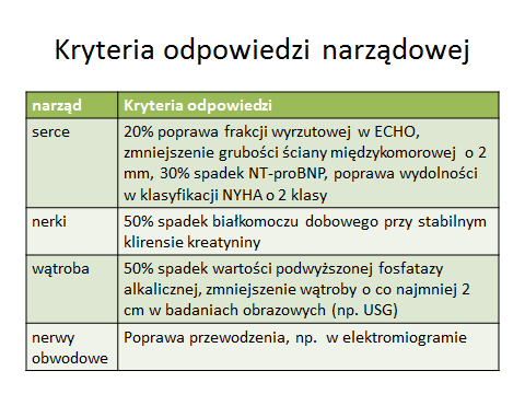 Odpowiedź hematologiczna świadczy o tym, czy i w jakim stopniu udało się wyeliminować patologiczne plazmocyty i przez to zahamować produkcję białka monoklonalnego przekształcanego do amyloidu. Kryteria odpowiedzi przedstawione zostały w tabeli powyżej. Ze względu na to, że w amyloidozie dochodzi do poważnego uszkodzenia różnych narządów, równie ważna jest ocena skuteczności leczenia w zakresie ich funkcjonowania. Co prawda nie da się całkiem cofnąć zmian, które już się dokonały, ale najskuteczniejsze leczenie, czyli ASCT (autologiczne przeszczepienie komórek macierzystych szpiku) może je odwrócić nawet o 65%. Są różne sposoby oceny odpowiedzi narządowej, niektóre z nich umieszczono w tabeli poniżej.