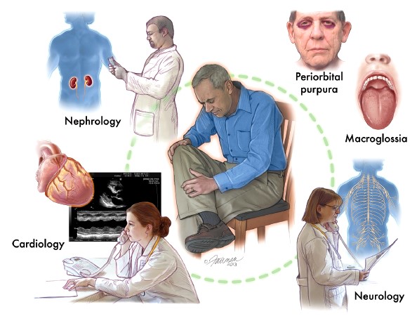 Poza postaciami ograniczonymi do jednego narządu pacjenci z amyloidozą, z uwagi na rozległe problemy zdrowotne, wymagają współpracy specjalistów z różnych dziedzin medycyny.