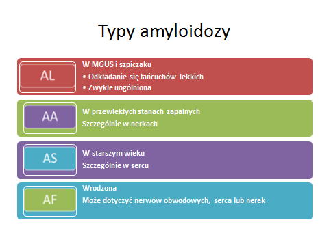 Istnieje wiele rodzajów amyloidozy, jednak najczęściej spotyka się cztery z nich. Pozostałe występują znacznie rzadziej.