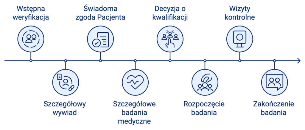 Po zakwalifikowaniu, uczestnik rozpoczyna udział w badaniu zgodnie z założeniami protokołu. Formy realizacji mogą się różnić – udział może mieć charakter: